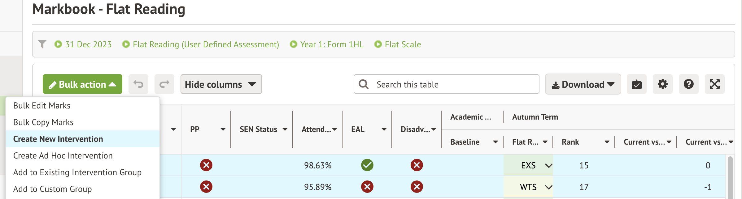 If you’ve got the School: Interventions: Administer permission, you can create an intervention right from any page with bulk actions, such as a summative assessment marksheet or the Lesson Dashboard.