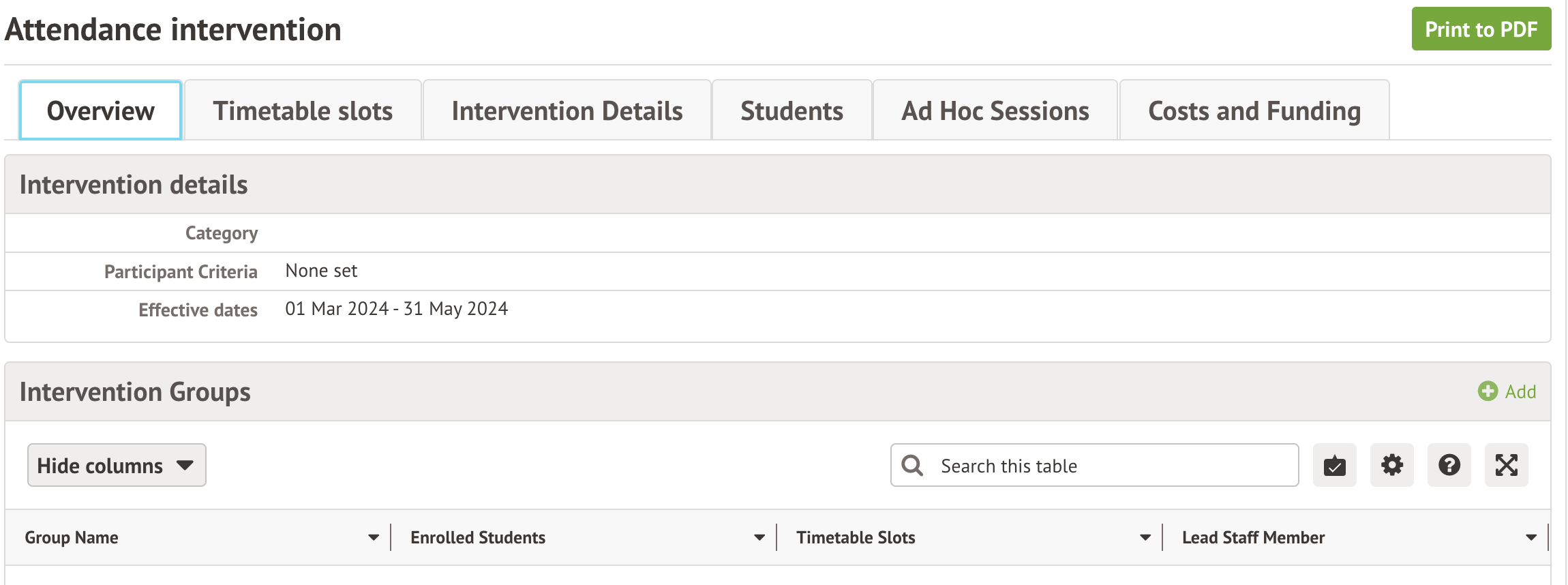 Click on an intervention to view details, enrol students or access a student intervention record.