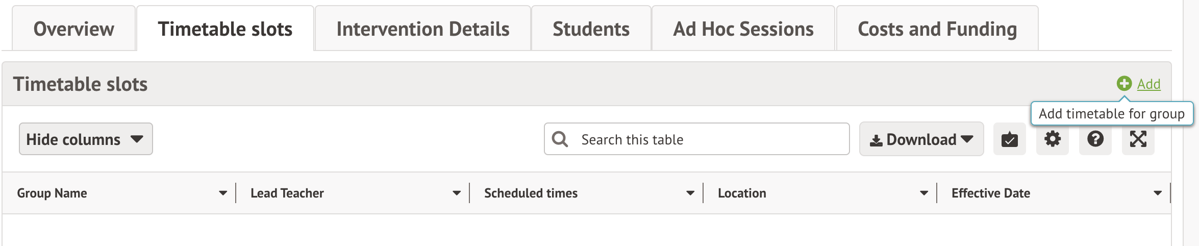 - select the group you would like to schedule sessions for from the Overview tab, then click on Intervention sessions in the left-hand menu.
