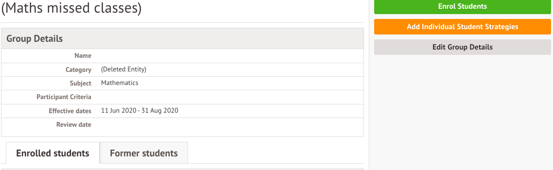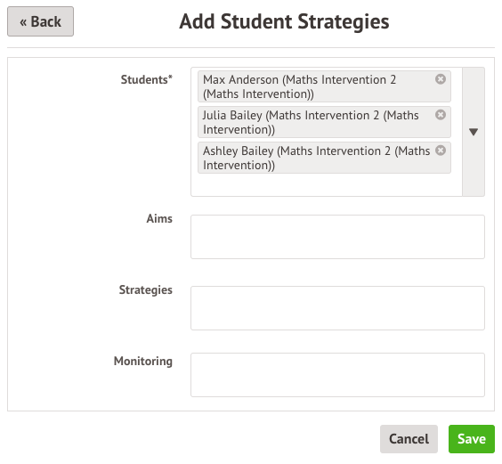 In addition to adding outcomes on an intervention level, it is also possible to add individual student strategies to each student enrolled in an intervention. Student strategies are useful when adding personalised information to an individual, or groups of students in an intervention.
