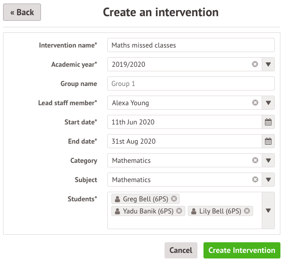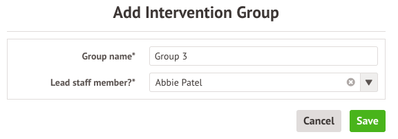 Add a group name, and select the Lead staff member. This person will have all the intervention sessions appear in their calendar - you can amend this or add further staff later.
