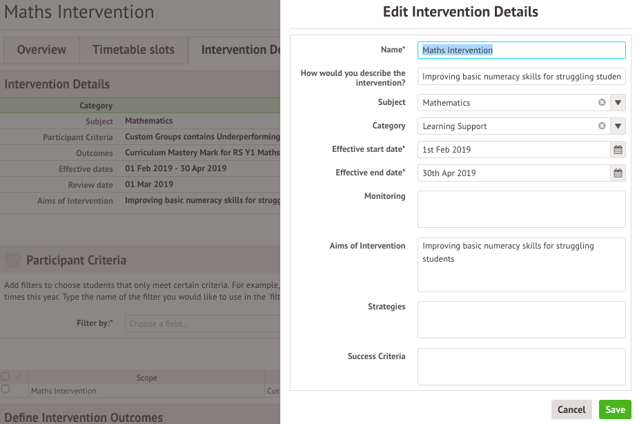 Intervention outcomes - the intervention outcomes are a set of targets that you hope to achieve by the end of the intervention. The success of the intervention can be measured by how many of the outcomes each student has met.