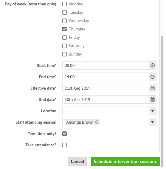 - Choose whether to require an attendance register or a room - great for interventions that take place outside school hours or classrooms.