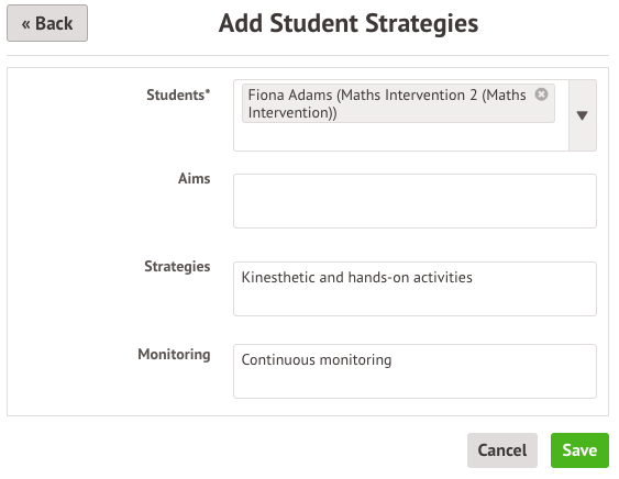 Please Note: it is not possible to add multiple strategies for one student. Adding a new strategy will overwrite the previous entry.