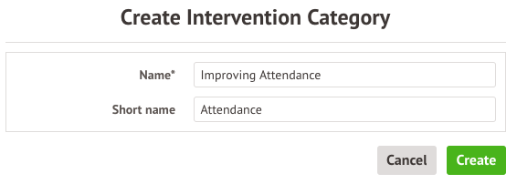 Here you can see a list of all the intervention categories currently set up for your school. Intervention categories are a way for you to group together and define different categories of interventions based on their particular area of focus.