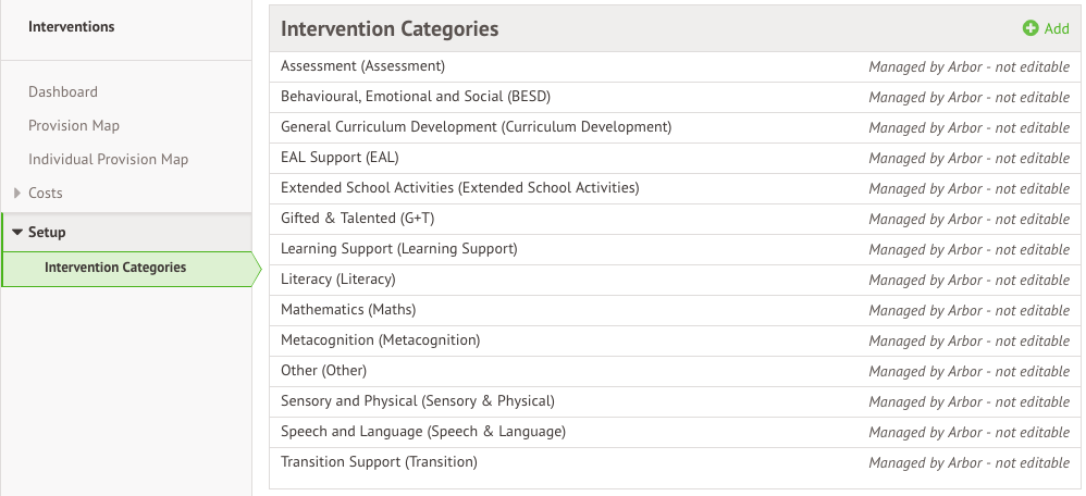To save you time in getting up and running with interventions, Arbor has defined a set of generic intervention categories, but you add a new category by clicking +Add.