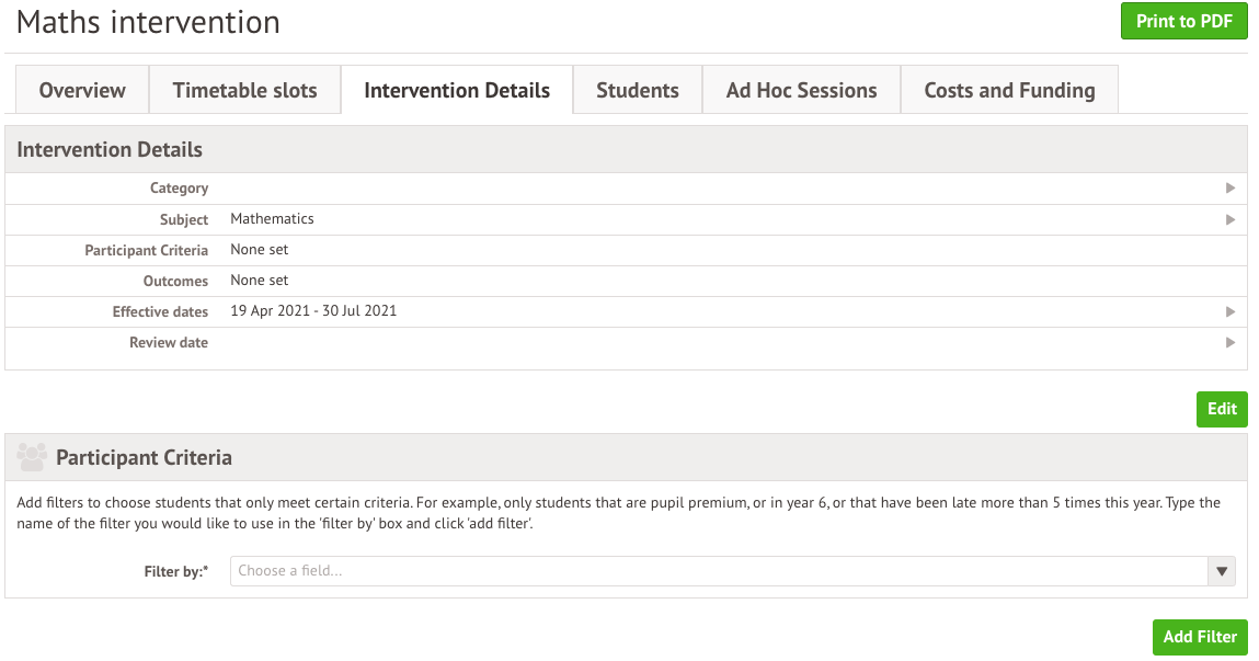 Interventions provide a comprehensive view of all interventions and allows SEN Coordinators and school leadership to monitor the allocation of resources and track trends over time.