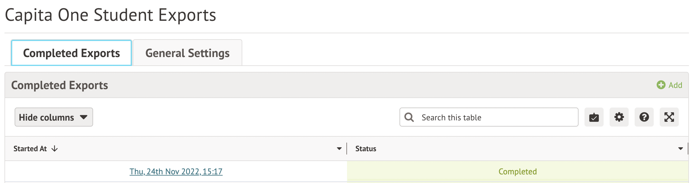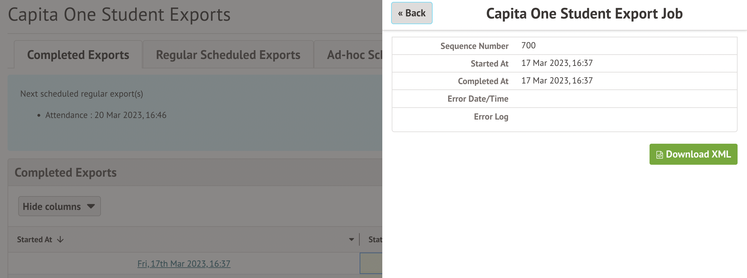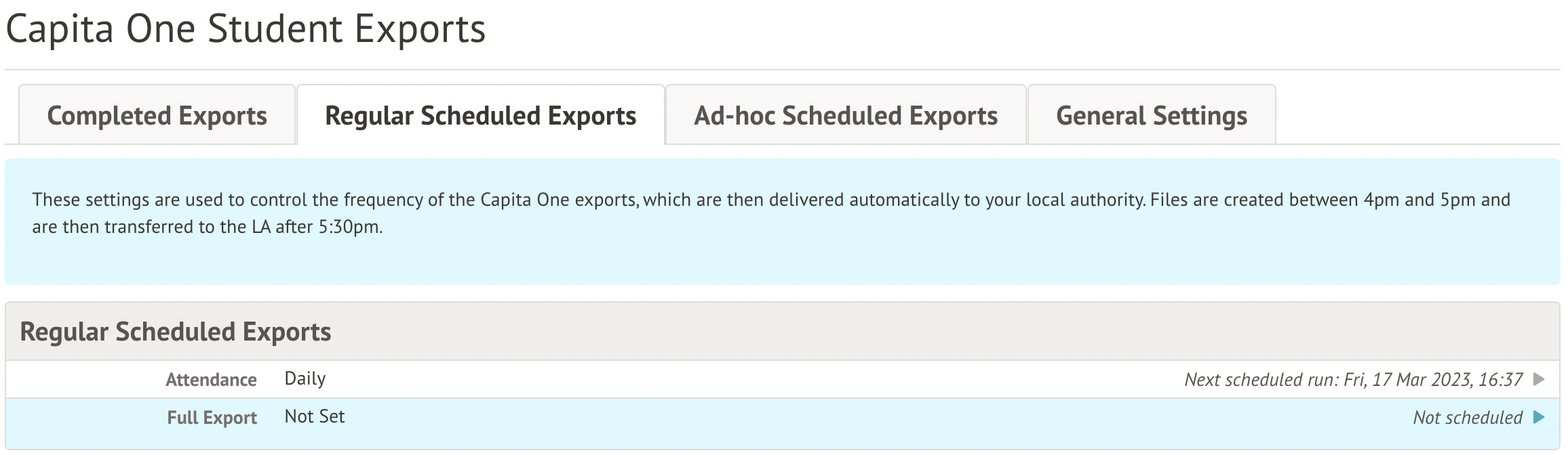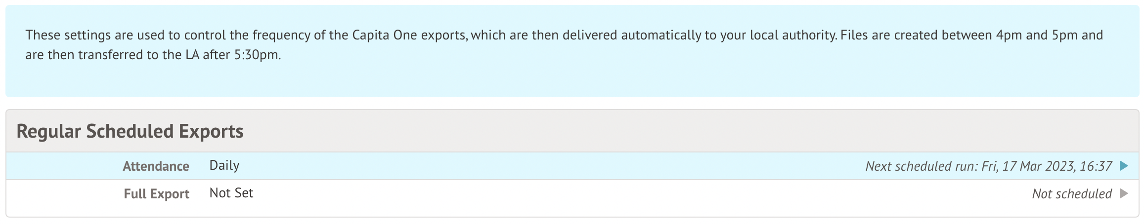 You can now create a Capita One Export that lists any students who have left in the past twelve months. This can be created ad-hoc or, if you have automated exports, you can also schedule it for a set time or set up a repeating schedule.