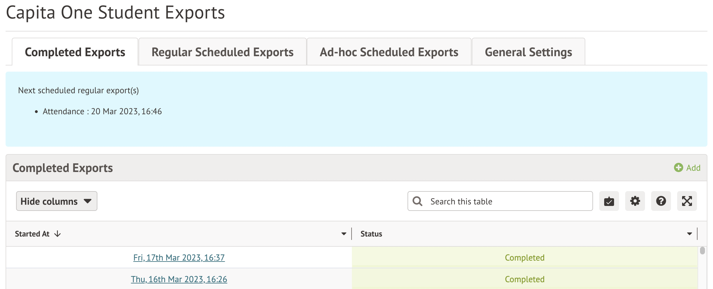 You can also see the completed exports, and when it will run next on the Completed Exports tab.