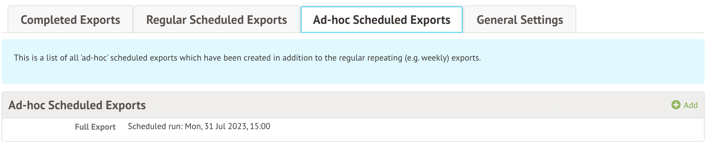 Click into the Ad Hoc Scheduled Reports tab and click +Add.