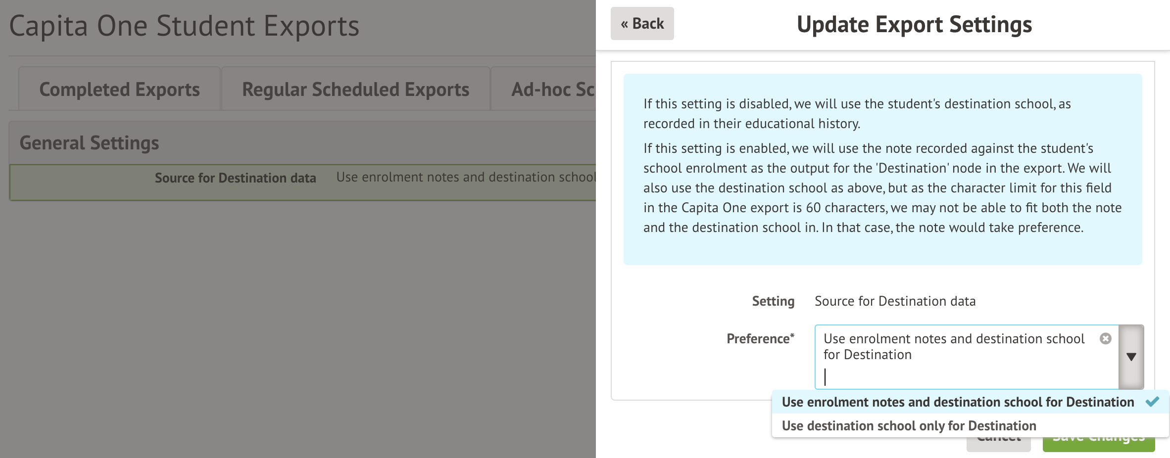 • If the other option is selected, we will use the note recorded against the student's school enrolment as the output for the 'Destination' node in the export. We will also use the destination school as above, but as the character limit for this field in the Capita One export is 60 characters, we may not be able to fit both the note and the destination school in. In that case, the note would take preference.