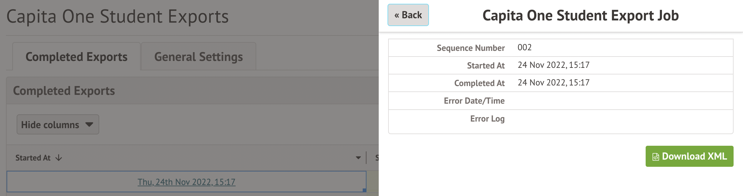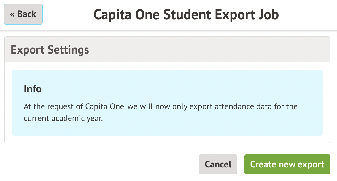 By default, the Capita One Export only includes attendance for the current academic year. It also: