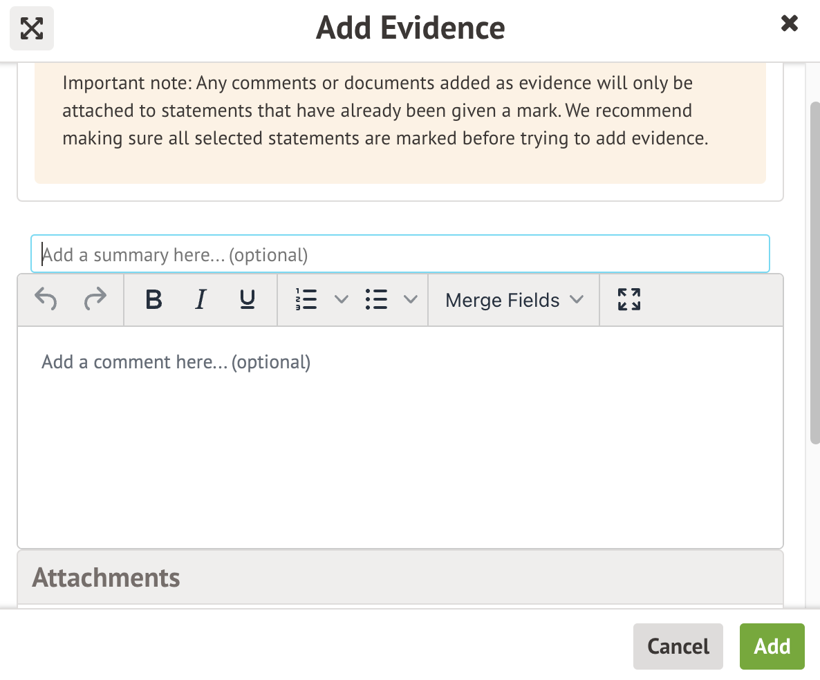 Please note: Any comments or documents added as evidence will only be attached to statements that have already been given a mark.