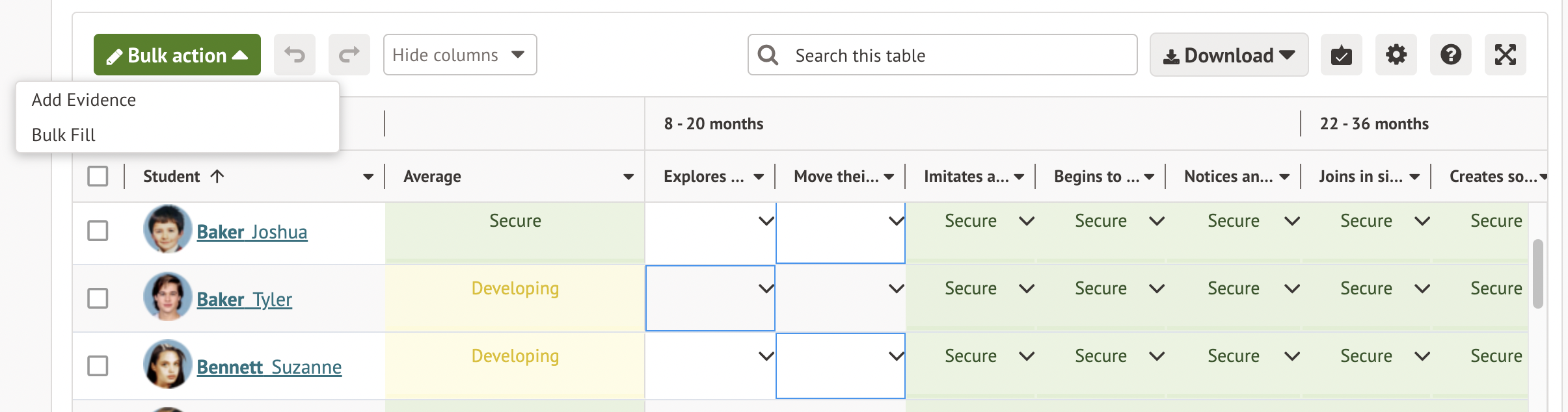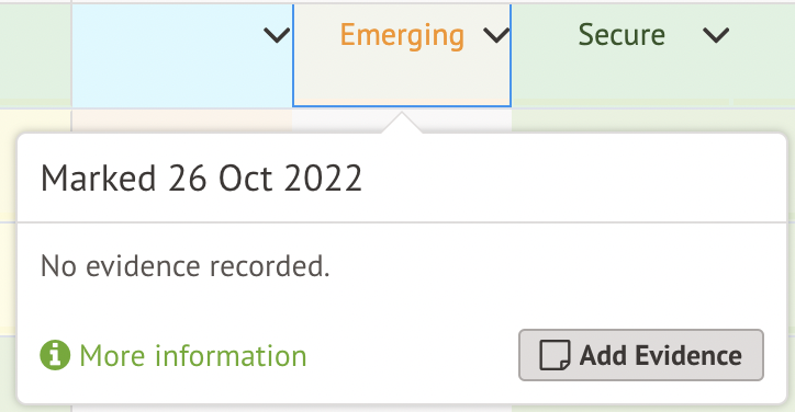 To record evidence, hover over the cell next to a student name and you will see an information window, click on Add Evidence.