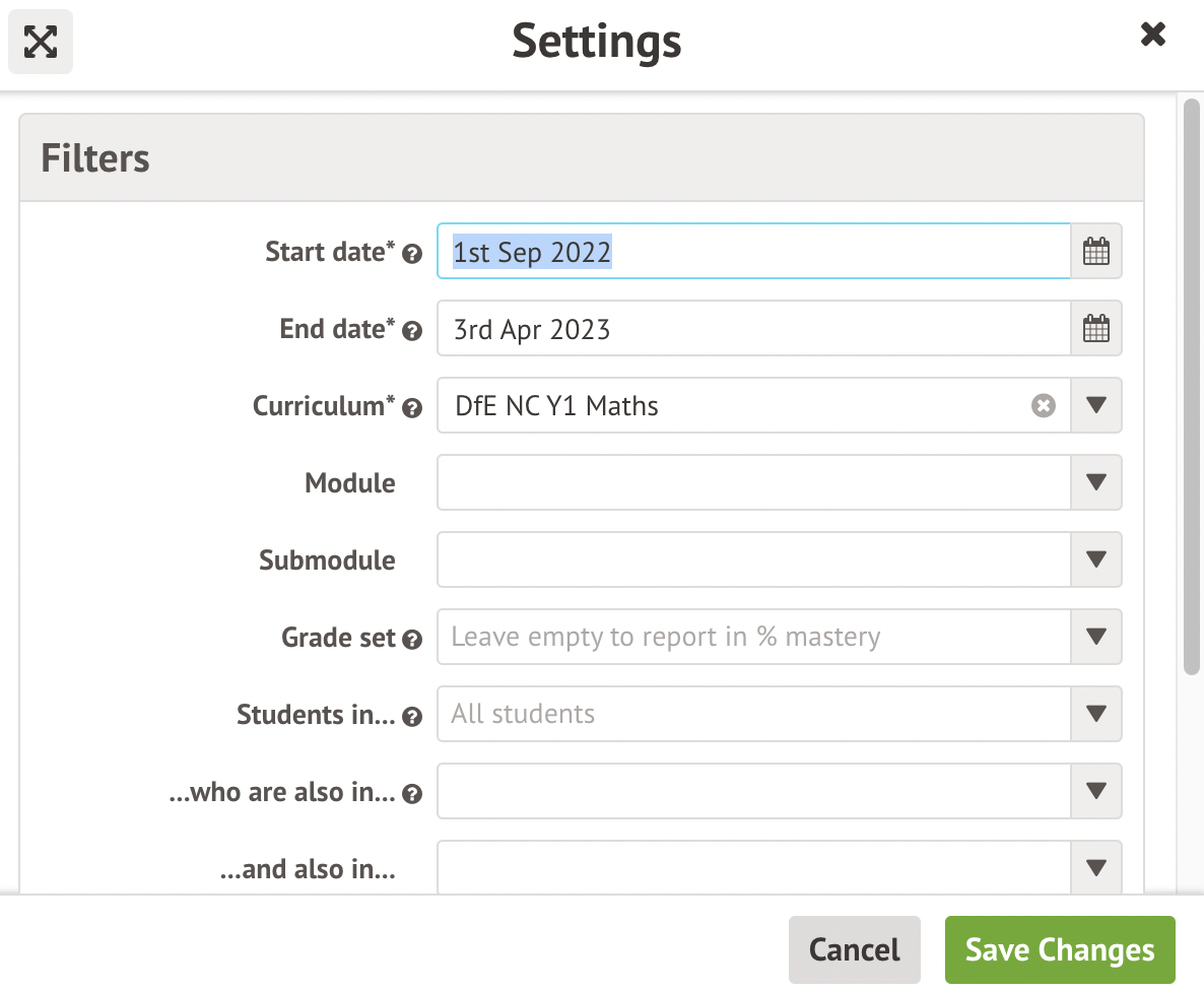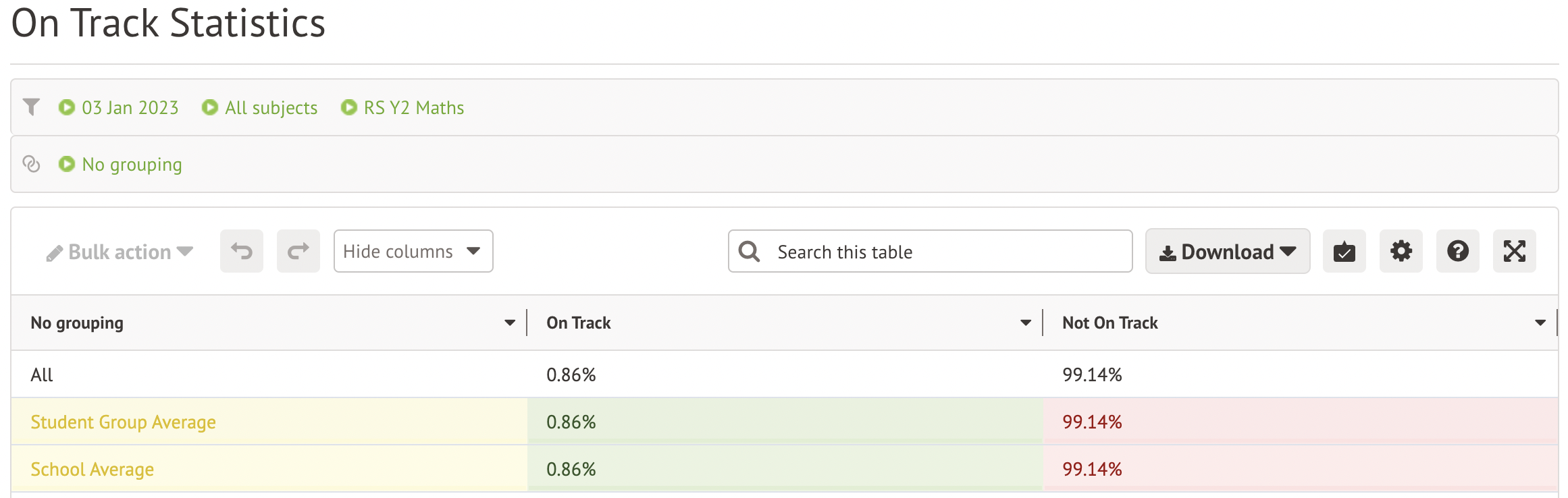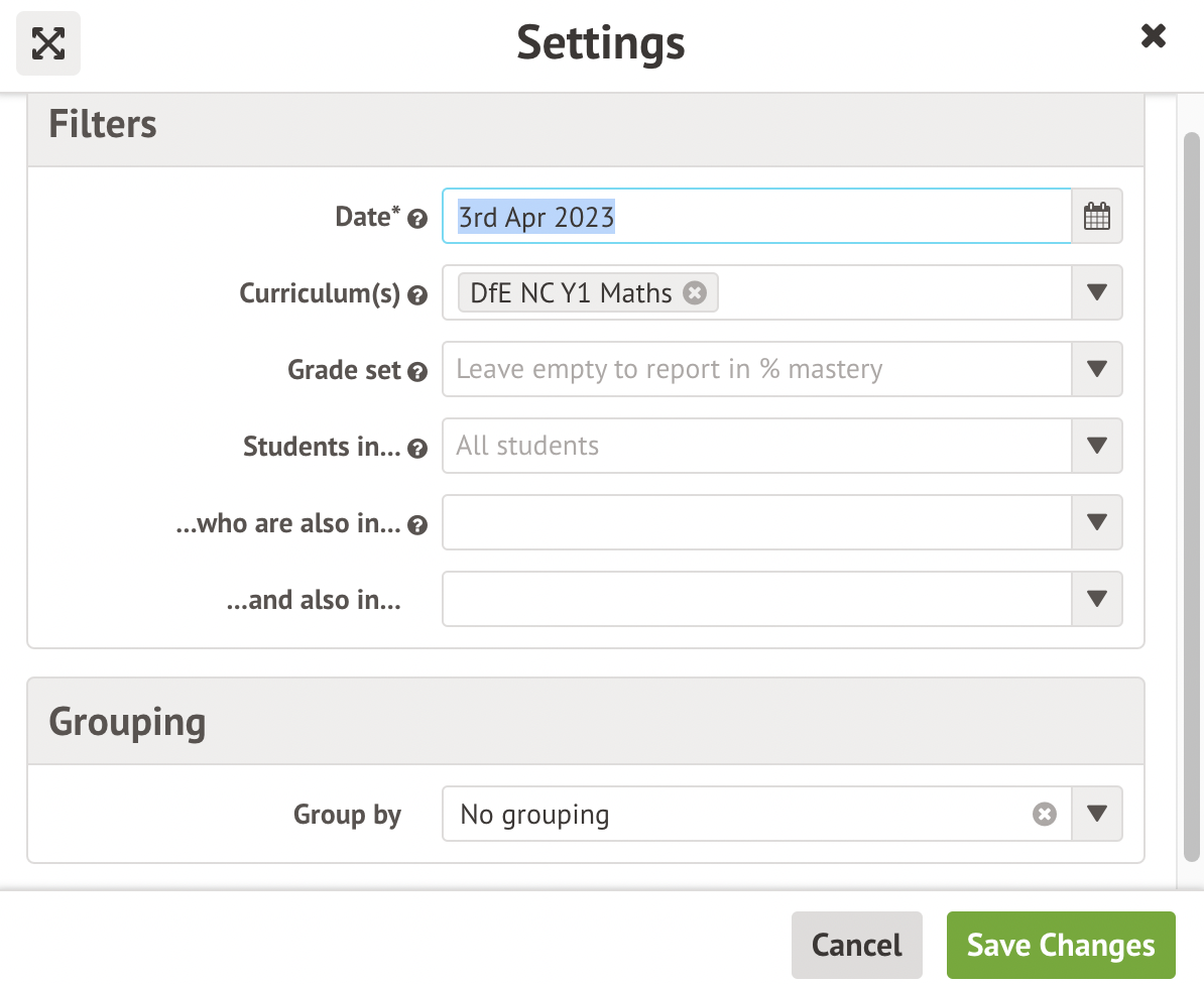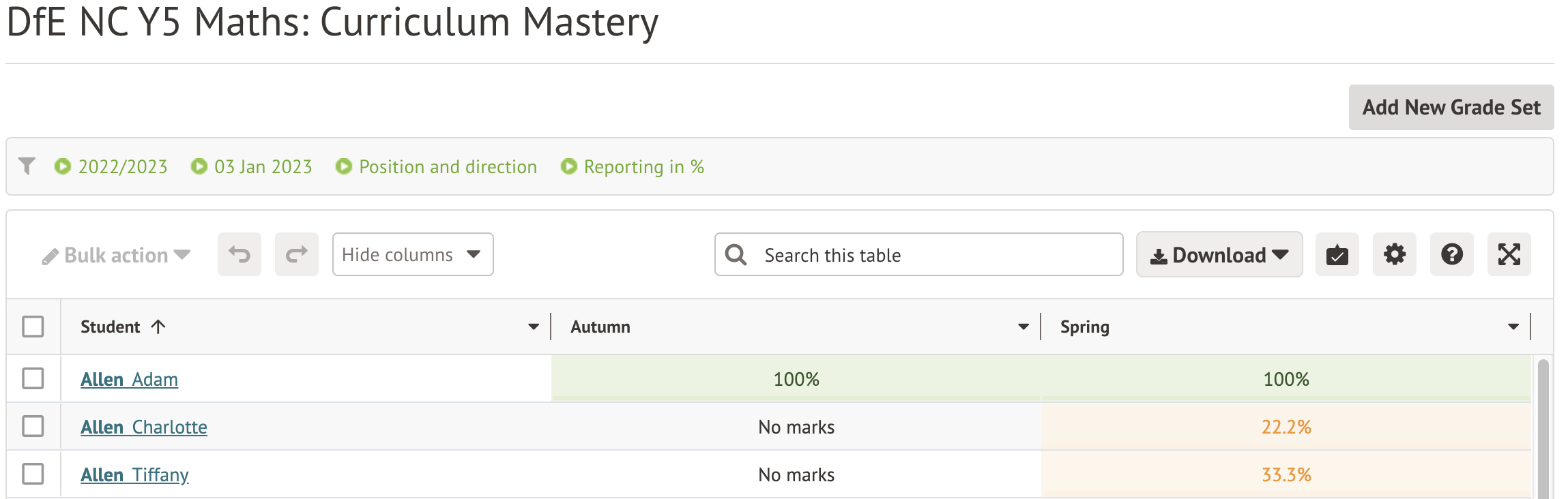 Using the filters, you can choose the Curriculum you want to view, grade set, students and choose to group students e.g. EAL v not EAL.