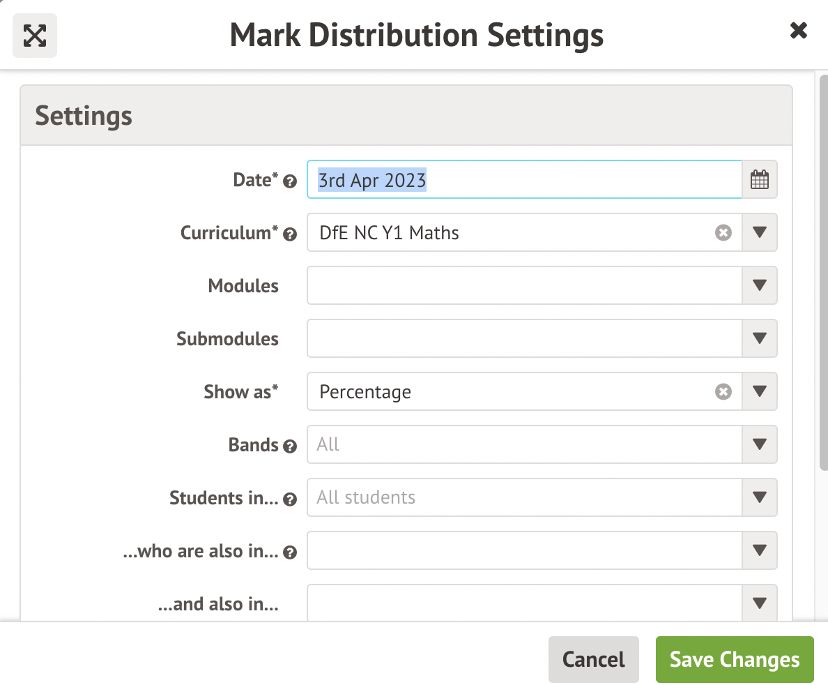 The Mark Distribution page allows you to view the average distribution of marks across a curriculum and then filter this information by groups. Go to Students > Assessments > Formative Tracking > Analysis > Mark Distribution.
