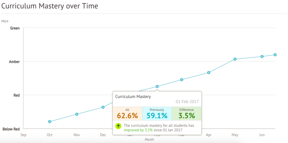 This lets you identify periods when the curriculum mastery may have stayed relatively static or is not progressing at a quick enough rate so that interventions can be planned.