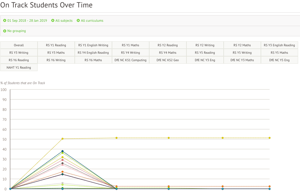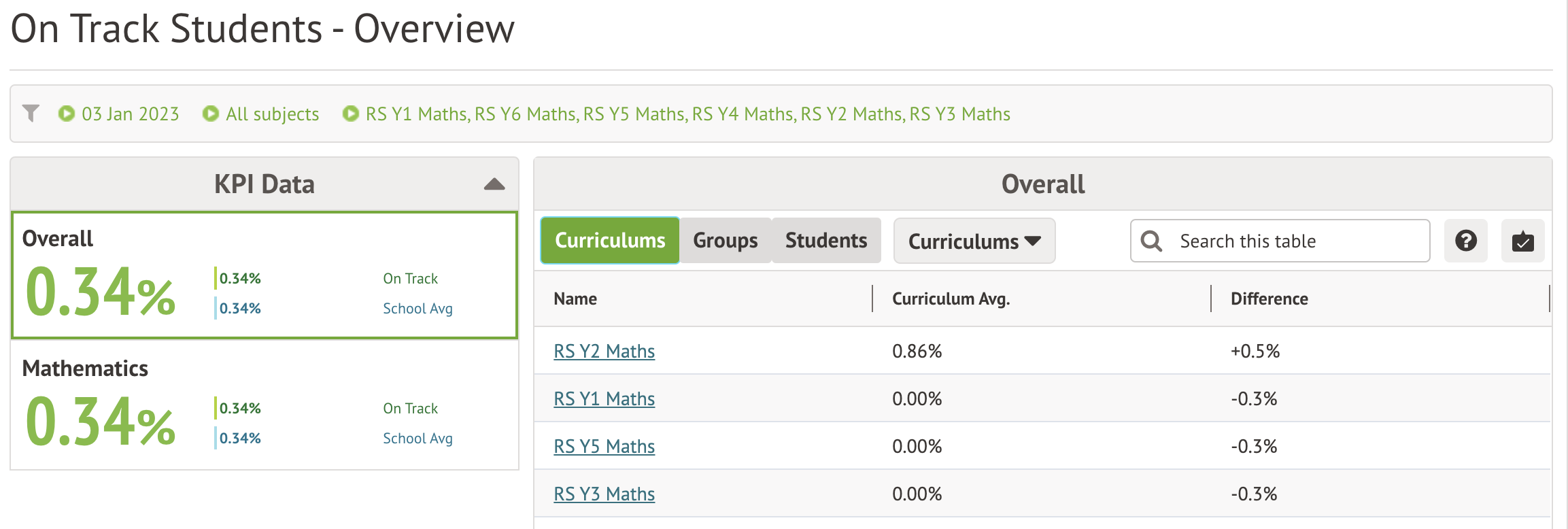 - The Overview page shows the percentage of students who are on track to meet their end of year expectations for each subject that you have set expectations for.