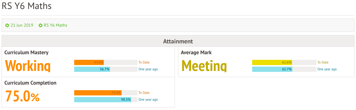 The Curriculum Completion in the example below is 75%. This means that if there are 100 curriculum statements, 75 of them have been marked.