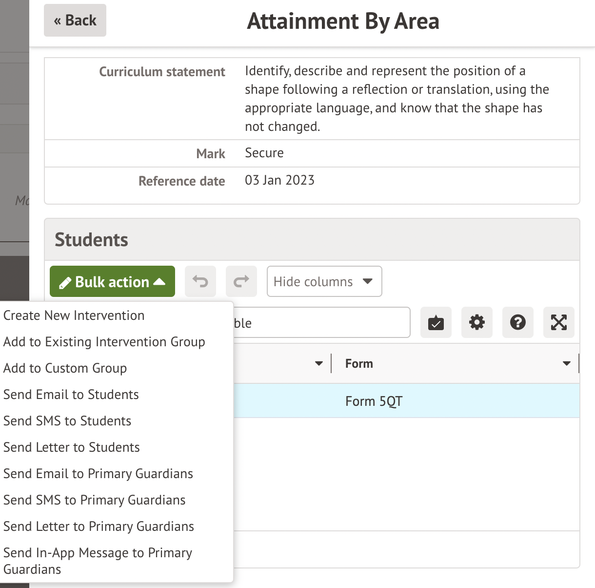 When you view all students, you can take further actions from here such as sending a communication or adding students to an intervention. You can also click on the student's name to be taken to the attainment area on their profile.