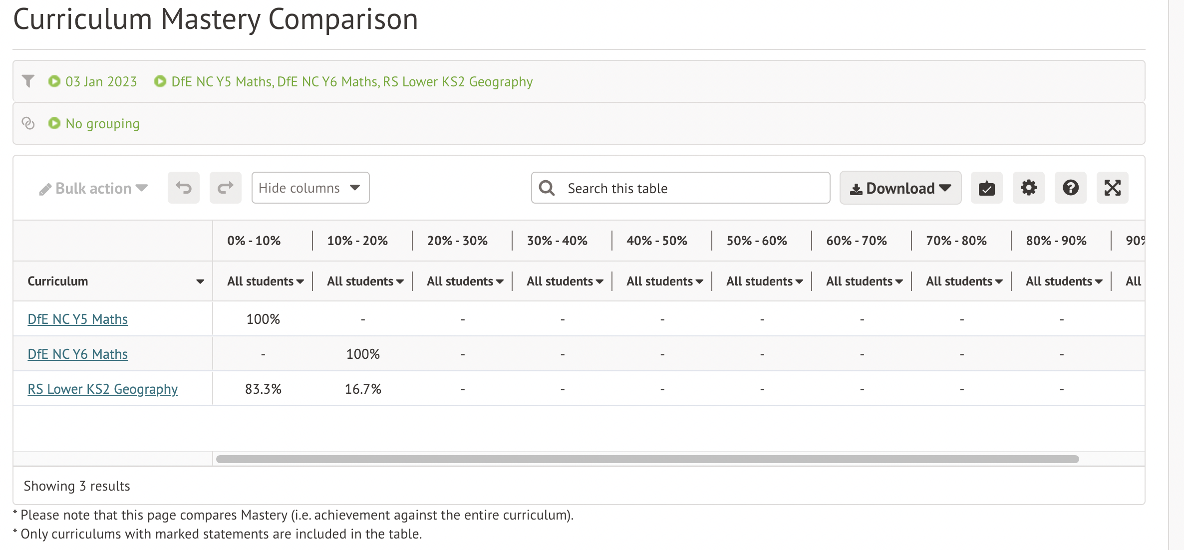 Curriculum Mastery refers to the average mark a student has out of the entire curriculum they are being assessed against. If a student was being assessed on a curriculum with 10 statements and only had 5 statements marked, the average comes from those 5 statements/10. To calculate the Curriculum Mastery, multiply the Curriculum Completion by the Average Mark.