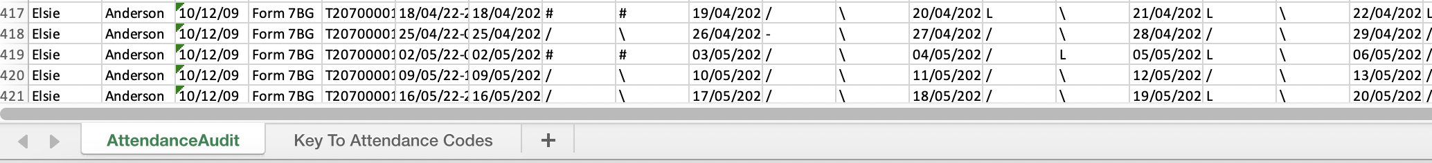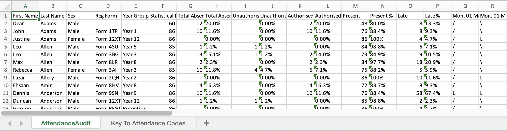 In this excel file, there is one row per student showing their numbers and percentages of presents and lates, as well as each AM and PM statutory roll call session marks. It also includes the student's first and last names in separate columns, sex, registration form, year group.
