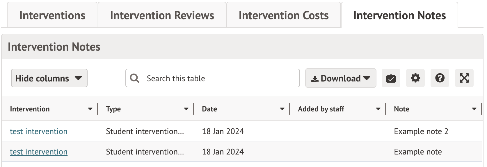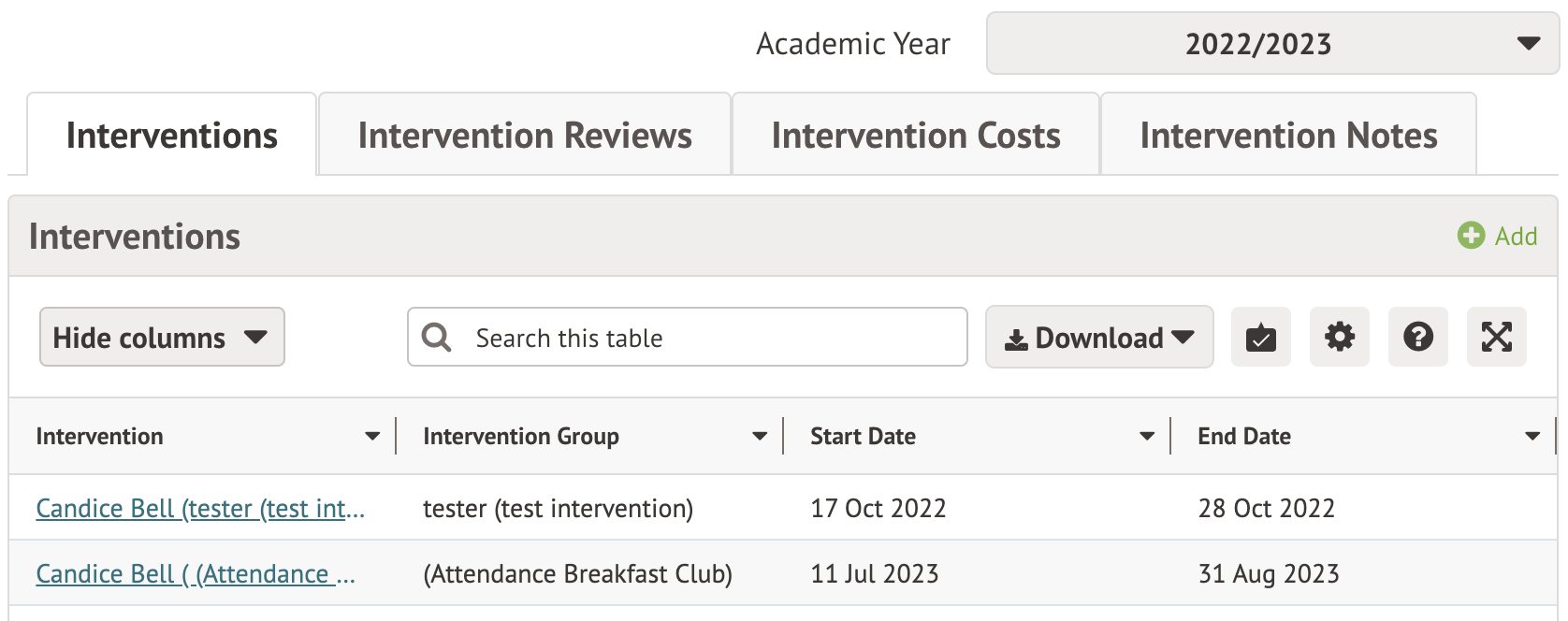 Interventions a student is involved in and their reviews and costs can be seen in the student's profile.
