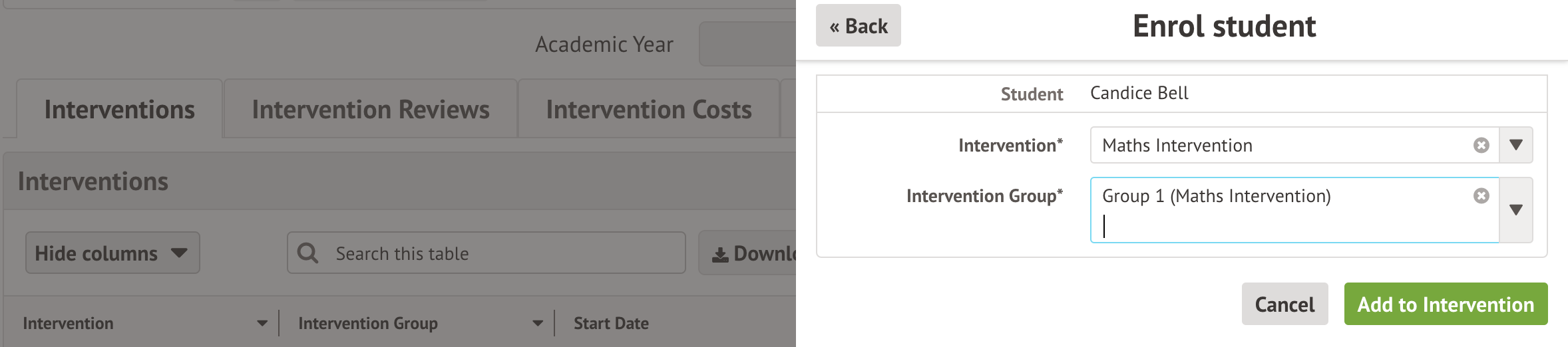 Go to the student profile and select the Intervention section from the left-hand menu.