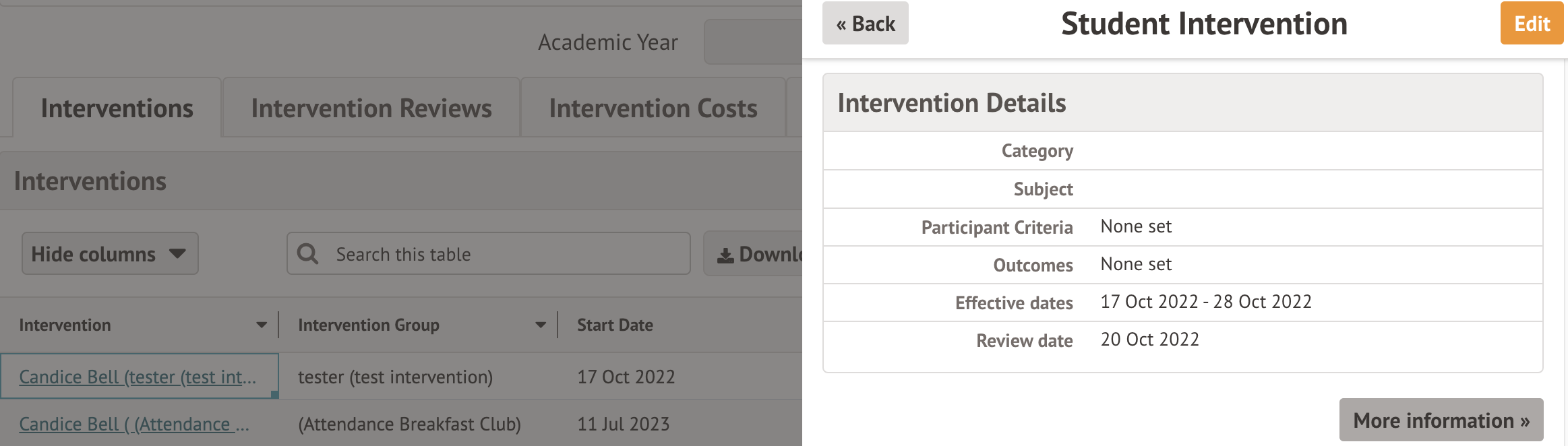 Once you have clicked on the intervention, you will be presented with a slide over. Click on the grey More Information button. This will take you to the intervention overview where you can add costs.