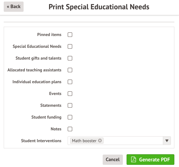 Hi Jackie, when you click the Print to PDF button, you can select which information to print out. You can select interventions if the student was ever enrolled in them, even if they are now no longer enrolled in the intervention.
