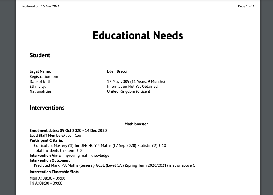 When you print out the child's interventions and other relevant SEN information, does this or can this include all previous interventions the child is no longer enrolled on?