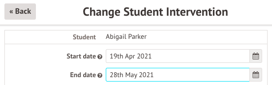 Change the end date, then scroll down and click the Save Student Intervention button.