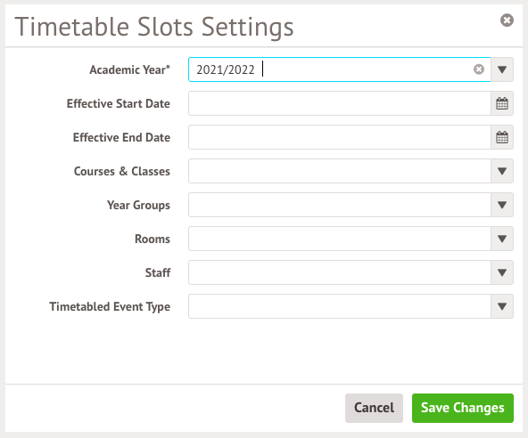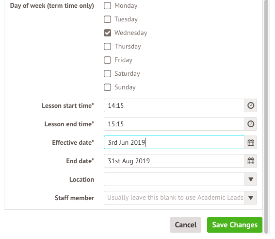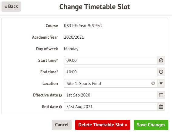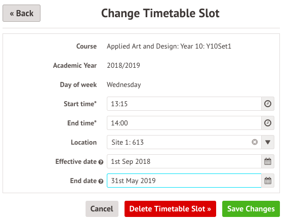 - Change the effective date of the timetable slot e.g. shorten a timetable slot from spanning the whole academic year to just lasting from September - December