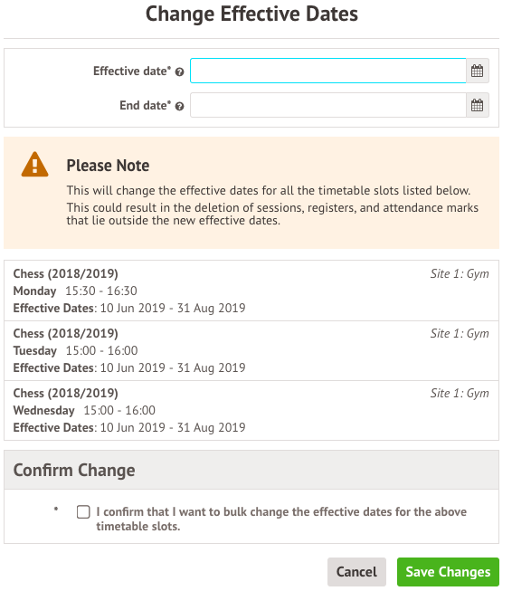 We recommend not to use this option to change the effective start date if you've already begun taking attendance, as this can impact your school’s statutory attendance for past registers. If you need to end slots, you can use the Bulk End Timetable Slots option instead.