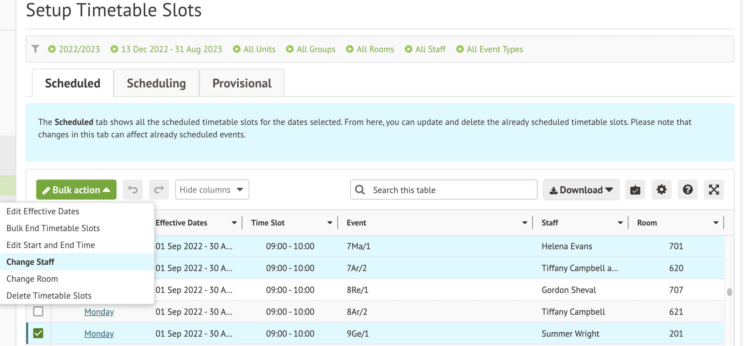 There are a few different things you can do with this action, such as adding new staff to timetable staff and removing old ones. We've outlined the options here, as well as some other options for how to change staff member's access to registers: Changing class teachers, academic leads and staff assigned to registers and timetable slots