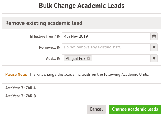 - Copy them from the timetable slot staff you already have: Copy Academic Leads from timetable slot staff