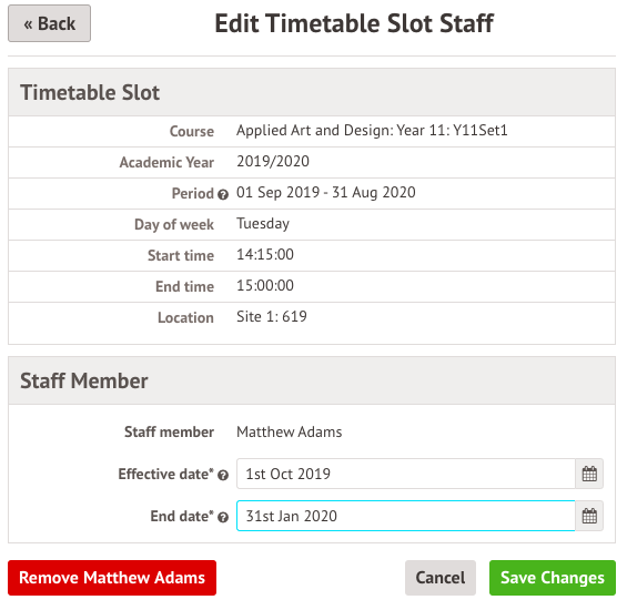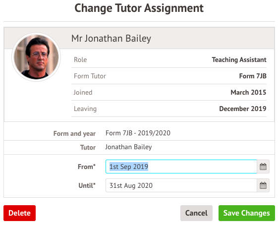 - Amend the end date of the incorrect form tutor to reflect the appropriate dates, then click Save Changes.