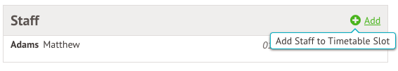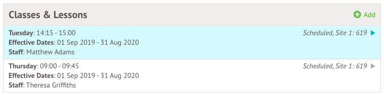 In the Classes and Lessons section, click the lesson and click +Add to add a new staff member to the lesson, or click the lesson to amend the staff member by clicking on their name.