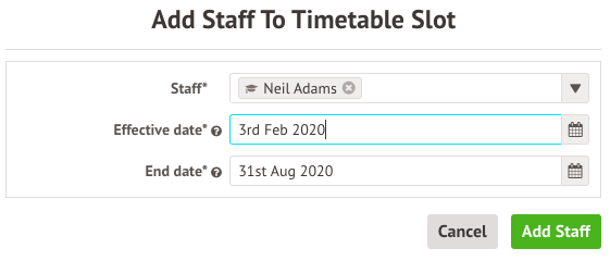 Select the new staff member, then set the Effective date as the first date they will be teaching this lesson, then click Add Staff.