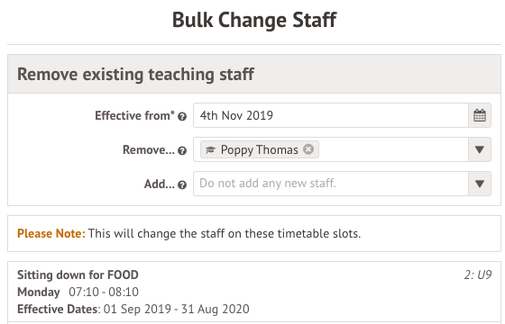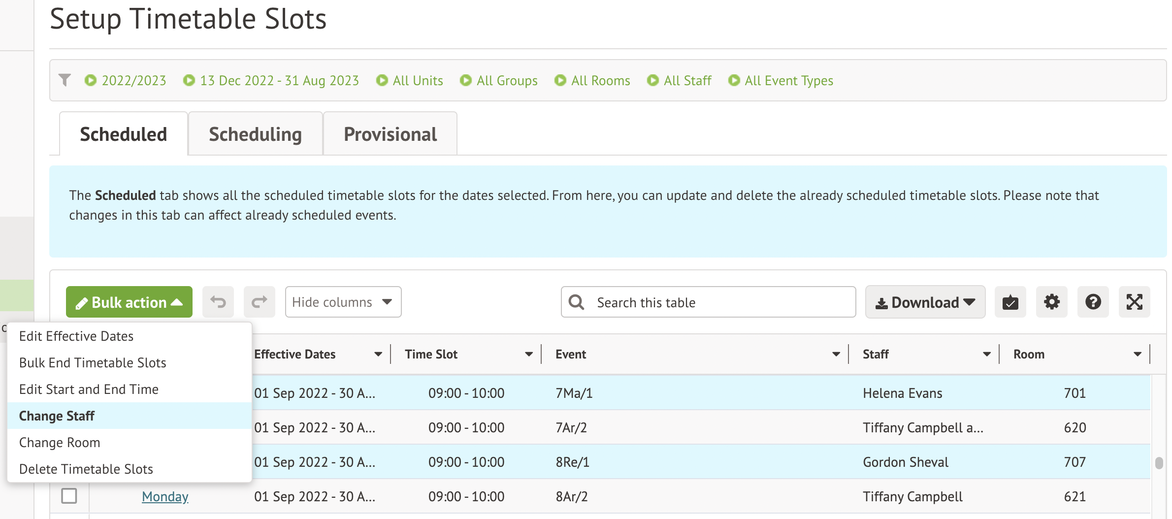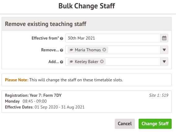 Top Tip: To remove a staff member from all slots, select all of the timetable slots and select Change Staff. Then select the staff to remove.