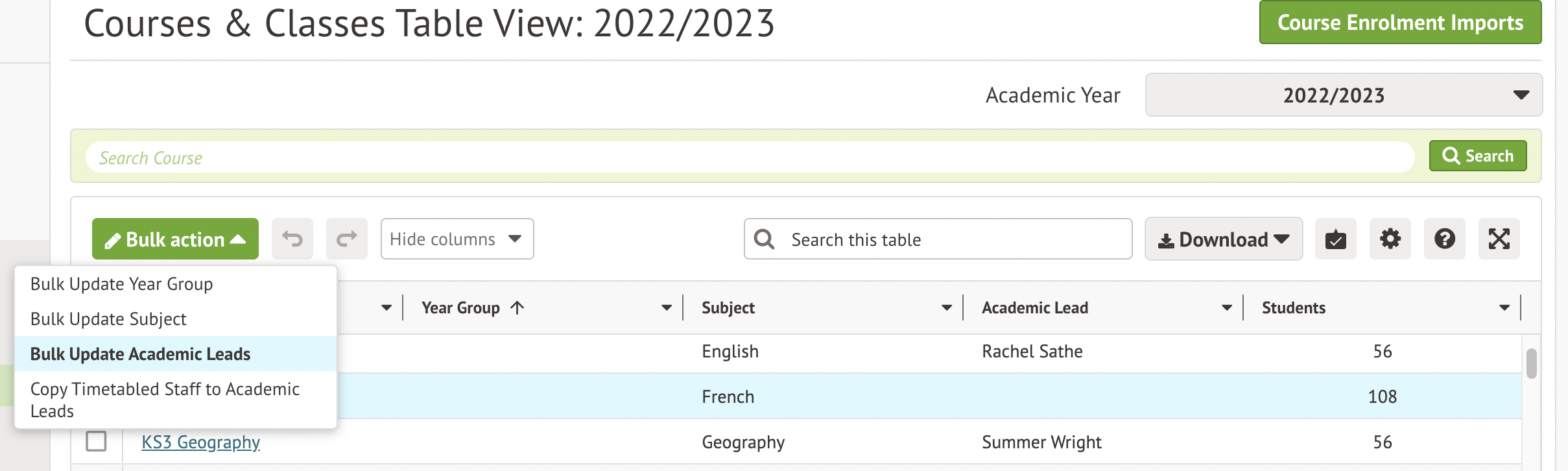Tick the boxes down the left-hand side of the courses you want to change the staff for, and click the Bulk action button to select Bulk Update Academic Leads.