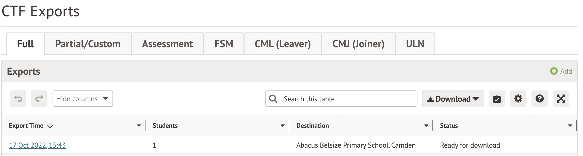 - CMJ (Joiner) Export - this type is a specific style of partial CTF - more on these can be found in the DfE's CTF guidance and the CMJ/CML specific section of this guide.