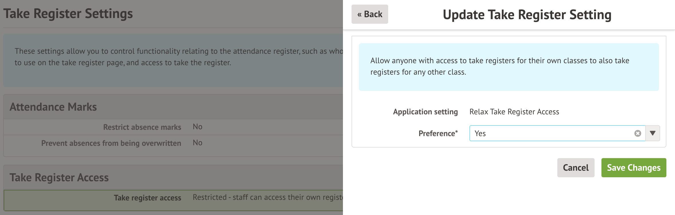 - Relax your take register access - if you want all your teaching staff and teaching assistants to be able to take attendance for any lesson