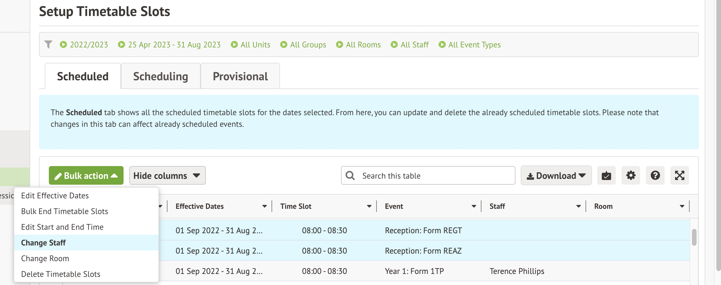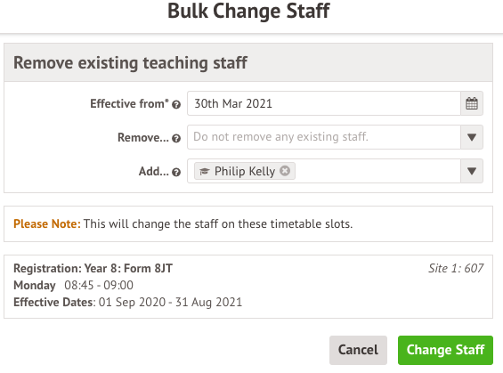 The selected timetable slots will now have the new staff member assigned to them, and that staff member will be able to take the register for these lessons.