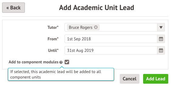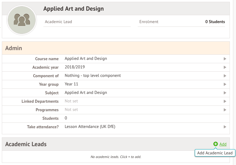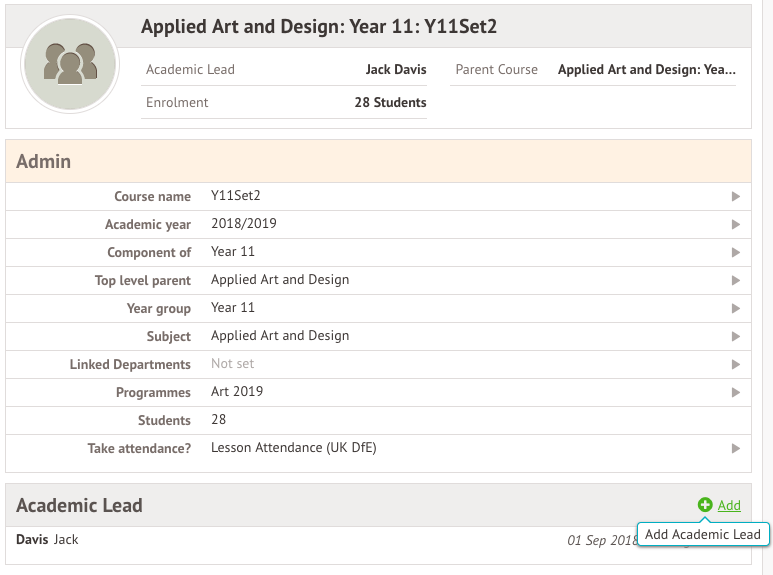 - Make sure you tick the box to set the staff member as an academic lead for all of the course's sub-modules to allow them to take the register for all Applied Art and Design classes.