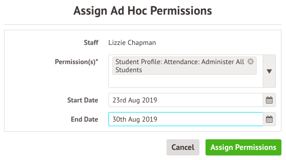 - Set the Dates between which the should have the permission - If you only want the staff member to be able to take registers for a short period of time, you can select an End date for the permission so they will no longer be able to take all the registers after this date.