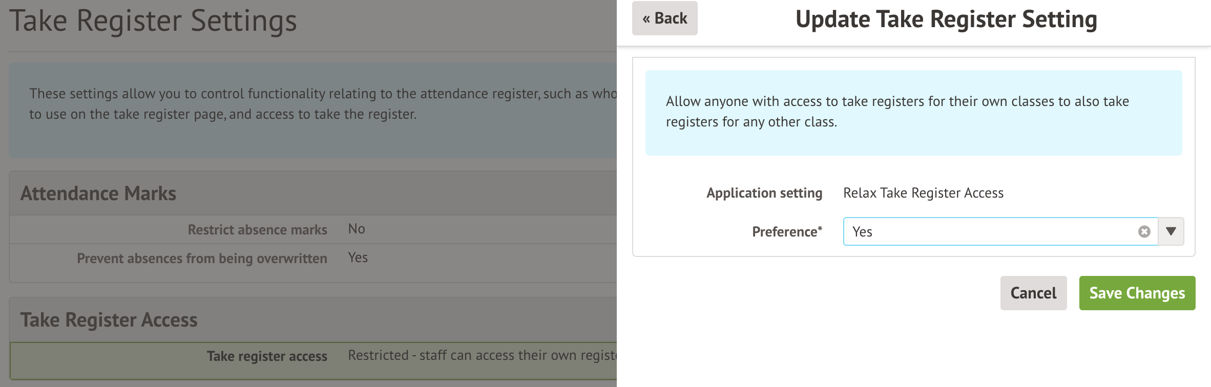 - Relax your take register access - if you want all your teaching staff and teaching assistants to be able to take attendance for any lesson