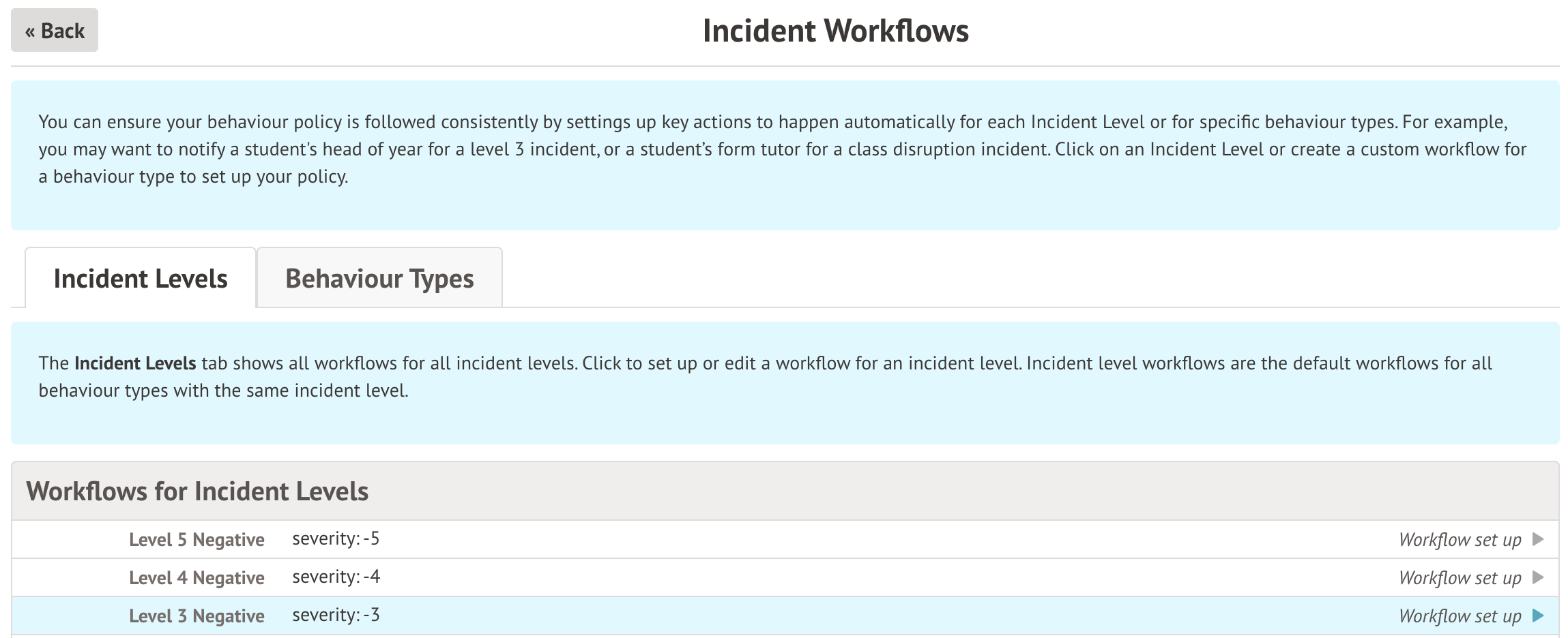 Your staff will then be able to log behaviour incidents in the same way as usual. When they select a behaviour type that has a custom workflow, the custom workflow will be used rather than the default workflow for the severity level: Logging, editing and resolving Behaviour Incidents