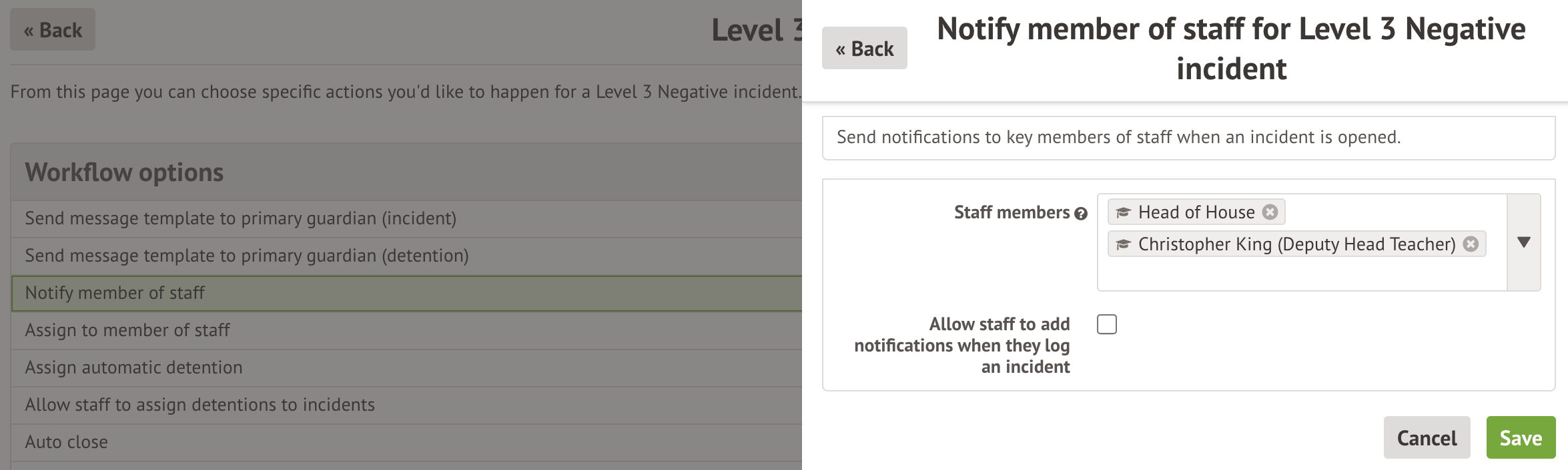1. To set up notifications, choose a level of incident and click 'Notify member of staff' on the incident workflows page.