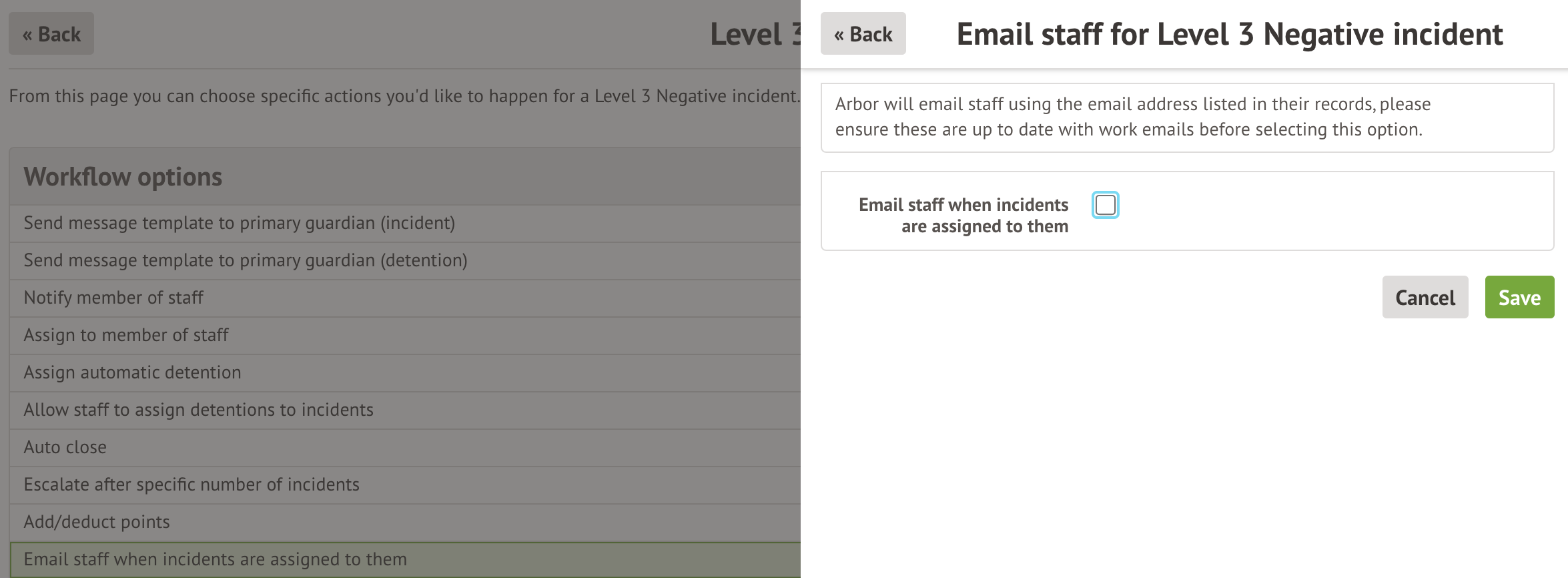 You can choose to notify primary guardians or staff of incidents or detentions. Top Tip: You can set up custom email or SMS templates to use with each workflow: Set up different email or SMS messages for incidents and detention severities